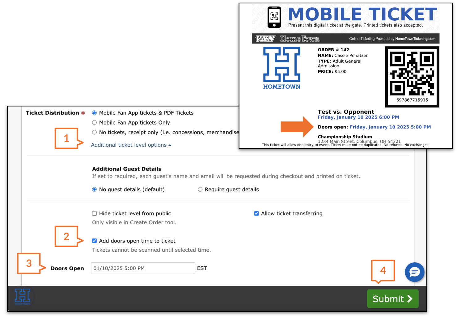 The Doors Open Time feature allows you to specify the exact time when doors will open for an event with a later start time. When this feature is used, tickets cannot be redeemed prior to that set time. This prevents ticket holders from checking in too early. This feature can be set up during the event build or updated at a later time. The doors open time will be listed on the digital ticket.