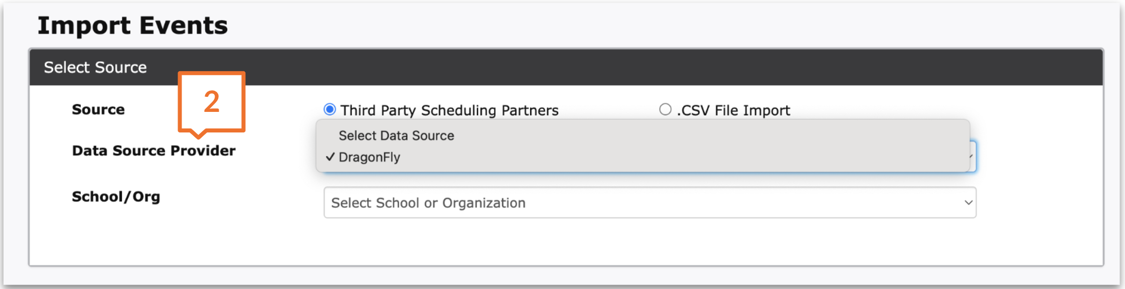 Under School/Org, choose the school you need to import events for