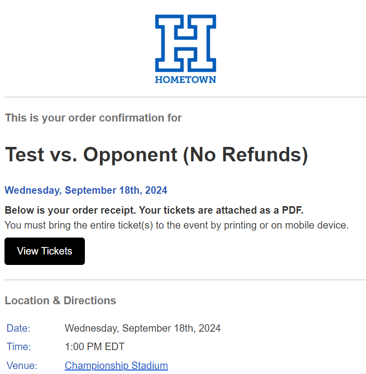 When you have select Do Not Allow Refunds as your policy within the Event Setup, this will be shown to purchasers directly within their confirmation. It will clearly state that there will be no refunds.