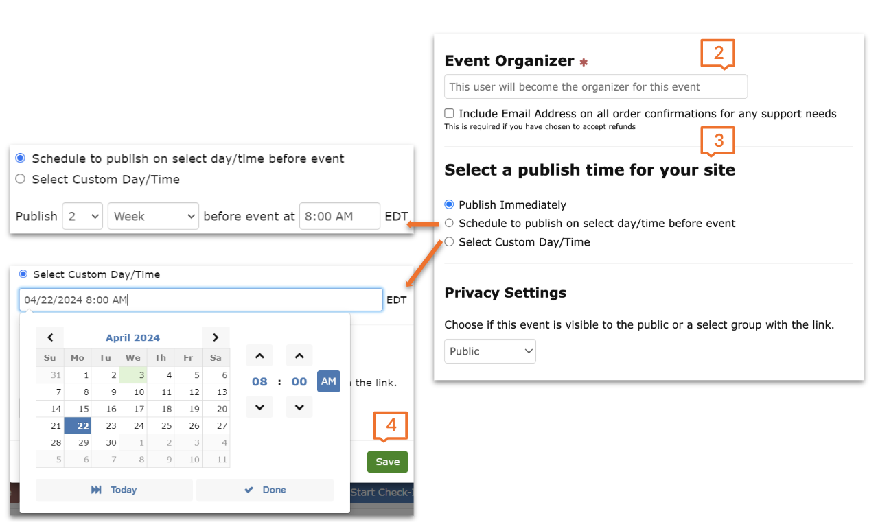 We recommend scheduling publish times when creating events, so you don’t have to worry about publishing them later!