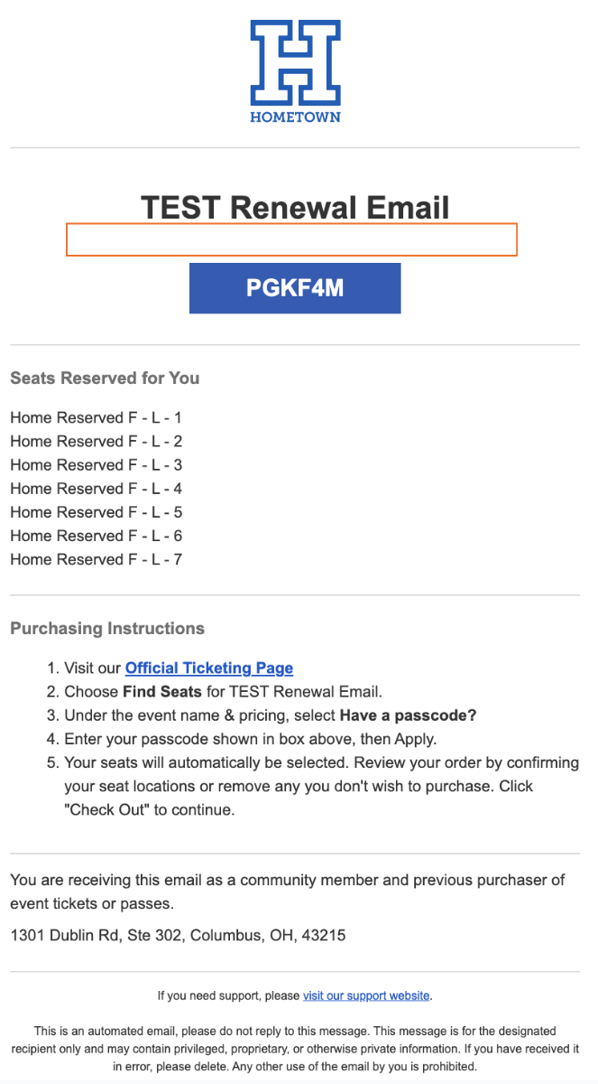 As part of the Season Ticket Renewal process, a Renewal Email is sent to all of last year’s ticket holders to notify them that renewals are beginning, and some additional details. Below is an example of the Season Ticket Renewal email. Additional verbiage can be added to this email, in the space highlighted by the orange box below.